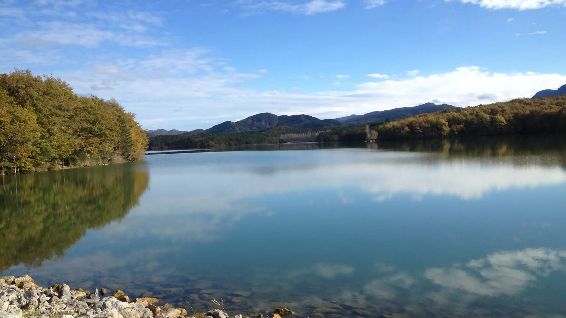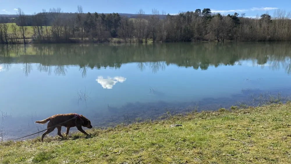 1- En la base náutica de La Régate, cruzar la presa por la izquierda, luego entrar en el sotobosque por la derecha. Siga la orilla del lago (balizas amarillas) hasta la presa.